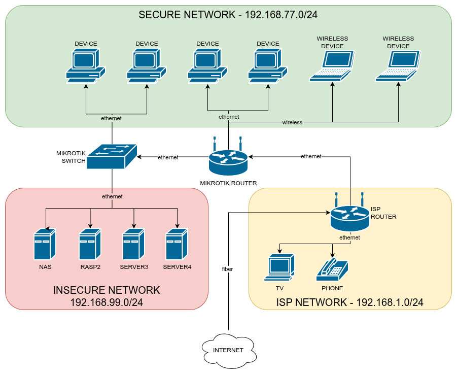 - ISP Network · This one I can't get rid of. For my TV and landline phone to work, they need to be directly connected to the ISP router. They are the only ones on this network. The Mikrotik Router is added on the DMZ of the ISP Router so that it manages every request to the network.