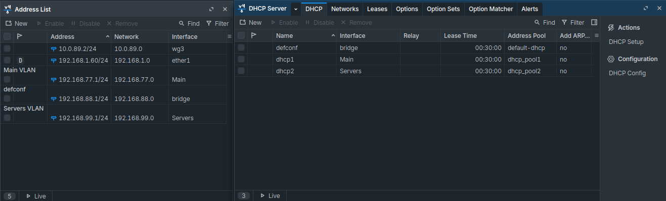 I then created addresses for the router in the different VLANs, as well as configured DHCP servers for the two networks.