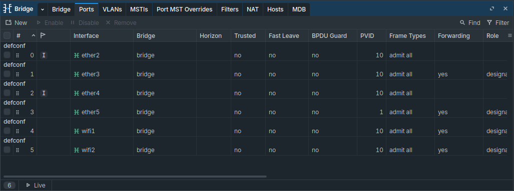 I then activated "VLAN Filtering" on the bridge, and then made sure every port is mapped to the right VLAN (ether5 is connected to the switch, which has its own configuration).